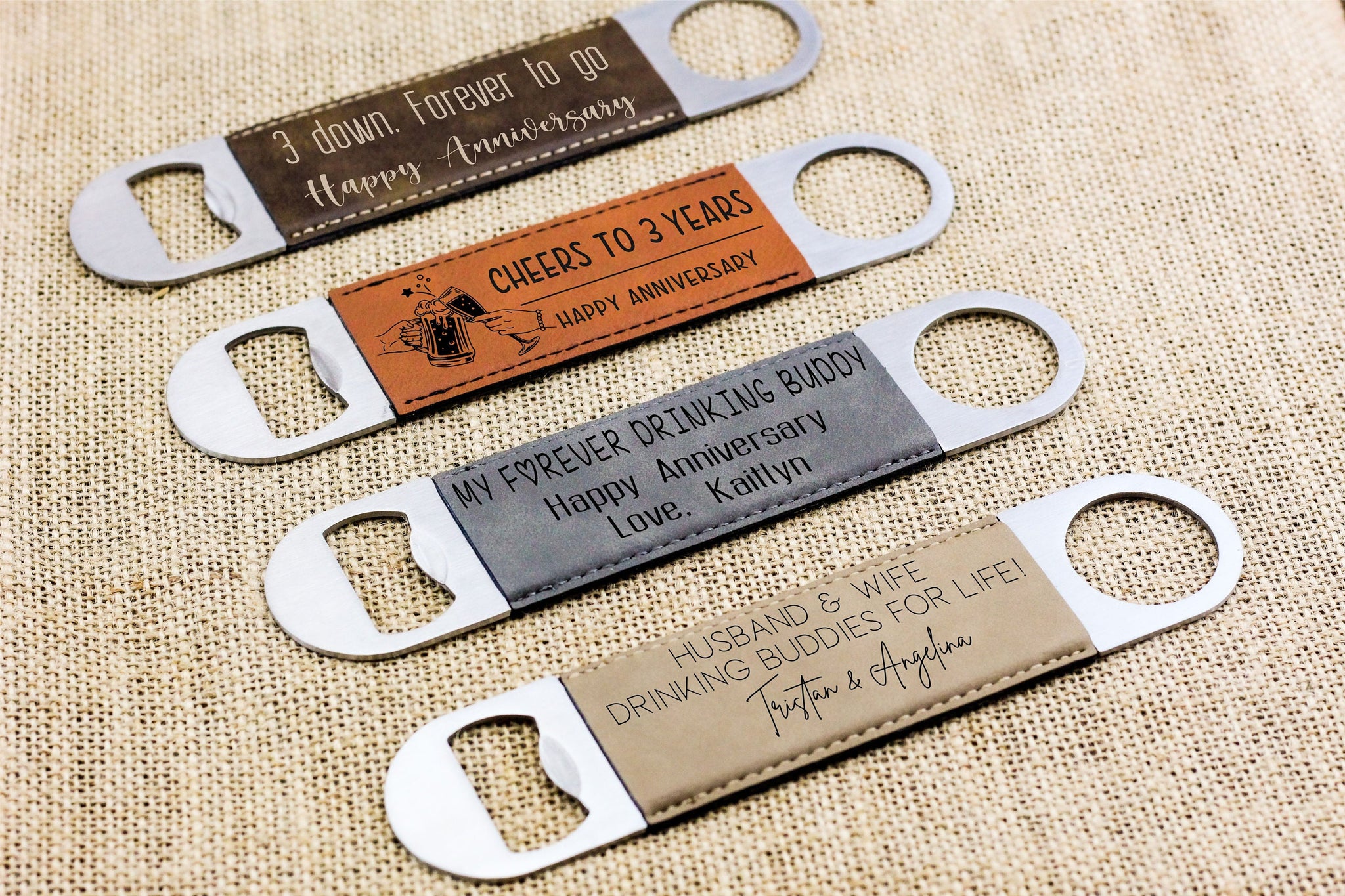 These leatherette Bottle openers are a great way to celebrate your 3rd anniversary and to provide a lasting reminder of how much you care. They make the perfect gift for your boyfriend, Partner or Husband.