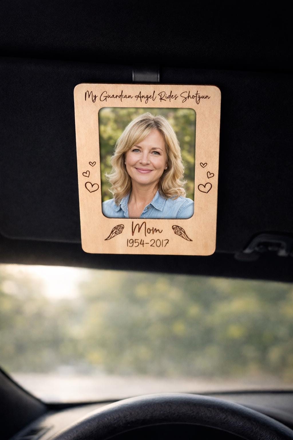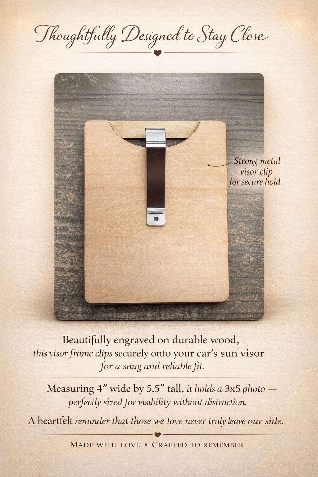 Beautifully engraved on durable wood, this visor frame clips securely onto your car’s sun visor. Measuring 4” wide by 5.5” tall, it holds a 3x5 photo — perfectly sized for visibility without distraction. A heartfelt reminder that those we love never truly leave our side.