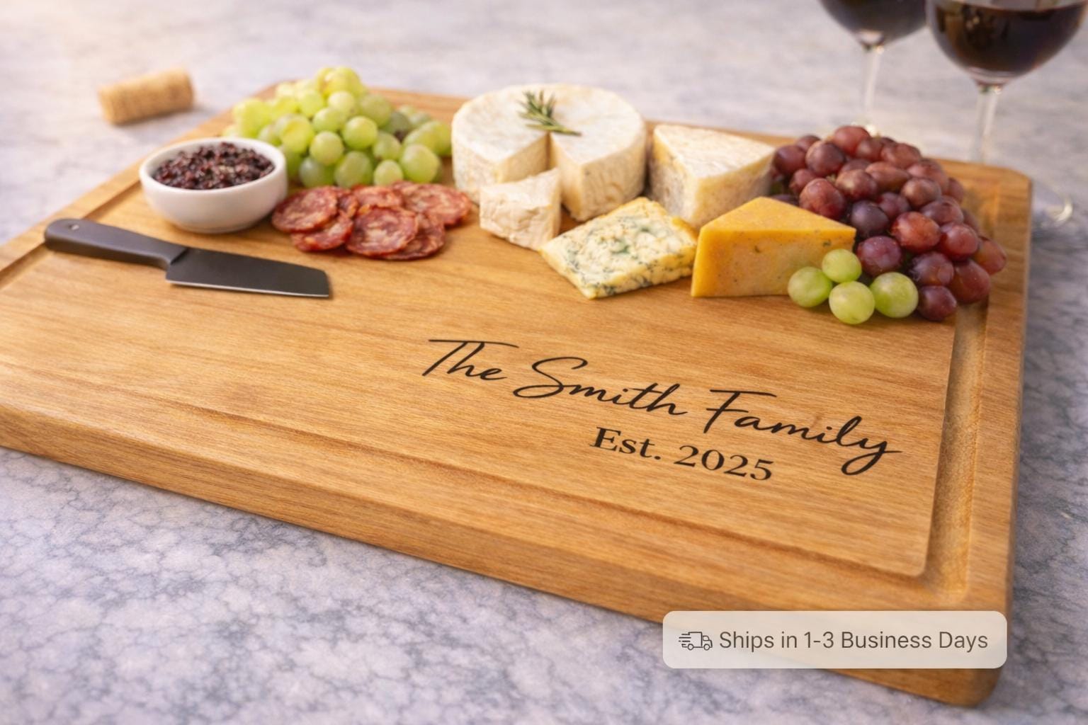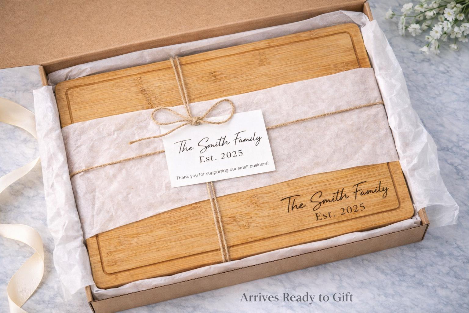 This custom engraved bamboo board is personalized with your family name and established date, creating a timeless kitchen piece for newlyweds, engagements, and housewarmings.